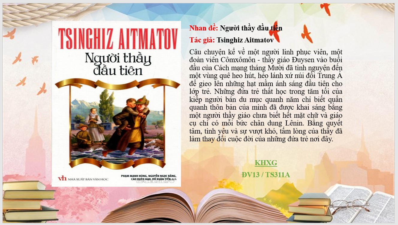 Trên bước đường lớn khôn và trưởng thành của mỗi người luôn mang đậm dấn ấn của biết bao người thầy, người cô đã không quản công sức, thời gian, tâm huyết để dạy dỗ, truyền đạt tri thức, động viên và khuyên bảo chúng ta nên người. “Tôn sư trọng đạo” là một truyền thống quý báu và tốt đẹp từ ngàn xưa đến nay, thể hiện tấm lòng biết ơn, kính trọng của học trò đối với thầy cô giáo của mình. Nhân dịp kỷ niệm 43 năm Ngày Nhà giáo Việt Nam (20/11/2025), Thư viện Trường THCS Hoa Lư trân trọng giới thiệu tới quý thầy cô giáo và các em học sinh, tác phẩm văn học kinh điển “Người thầy đầu tiên”.