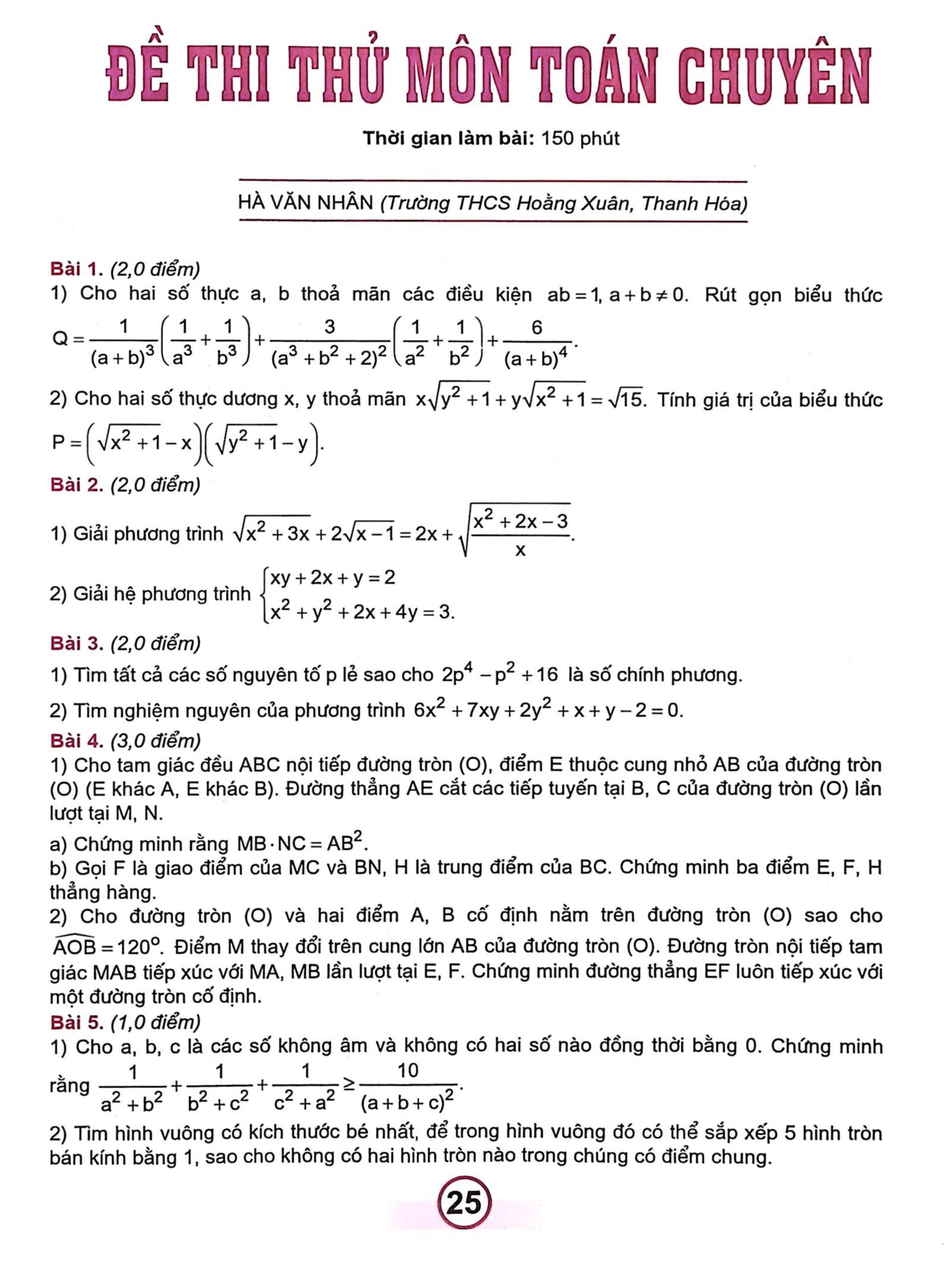 Đề thi thử môn Toán chuyên, năm học 2025 - 2026 (Thời gian làm bài: 150 phút) / Hà Văn Nhân // Tạp chí Toán tuổi thơ 2. - tr. 25 – 28. - Số tháng 1 (275) năm 2026.